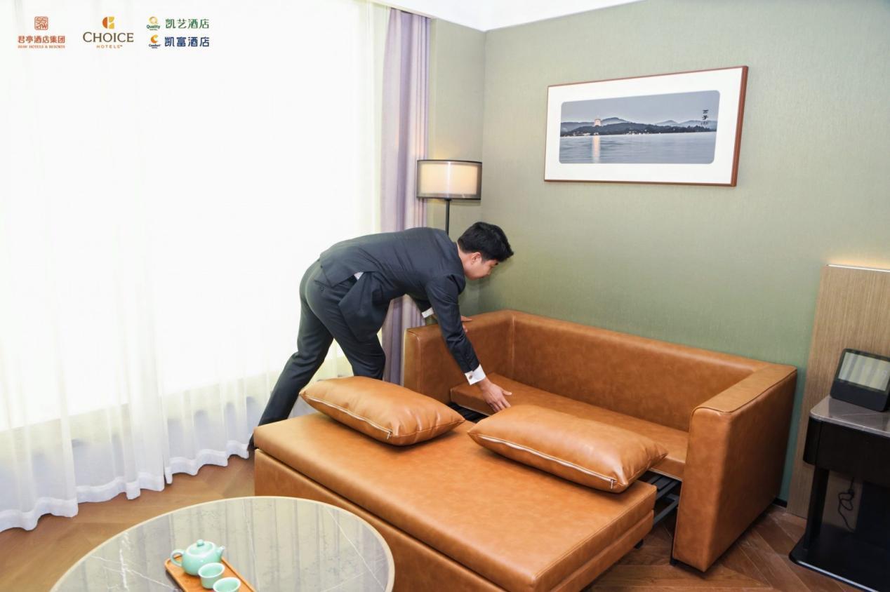 在体验重构方面,凯富并未照搬精选国际的标准化设计,而是注入了君亭标志性的东方美学基因,在空间布局上兼顾简约质感与雅致氛围。客房内配置的零压床能最大程度缓解客群的旅途疲惫,定制化“挺你”沙发则为商务客的临时办公、文旅客的休闲放空提供了舒适载体;公共区域与客房全域覆盖的Chill Vibe舒缓音乐,搭配全天候免费供应的气泡水,从听觉与味觉层面营造出轻松愉悦的氛围,让住客在酒店内即可卸下旅途压力。