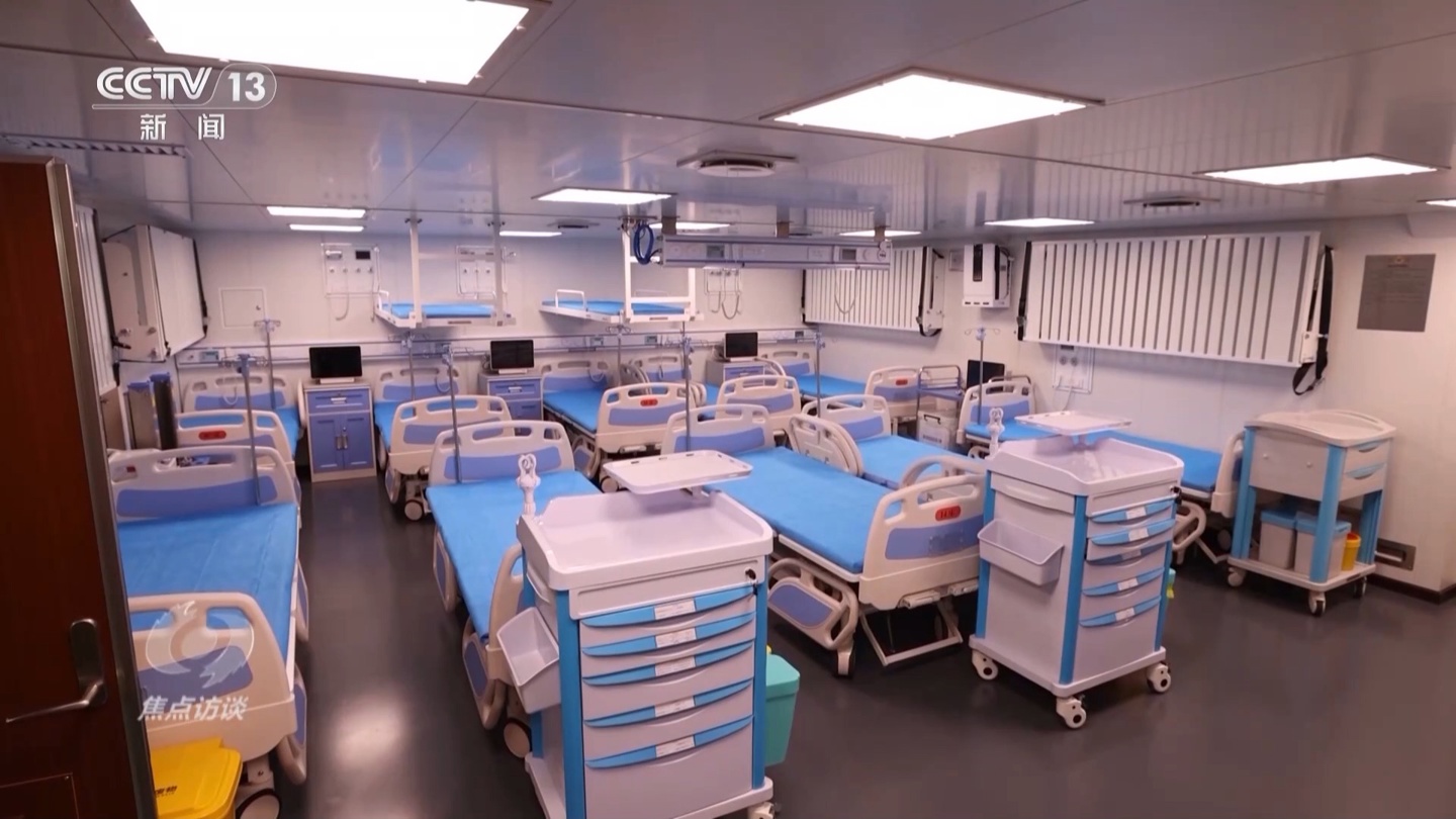 除了作战系统,福建舰在综合保障方面也有所侧重。据海军福建舰的雷勇刚介绍称:福建舰的医务中心是海军作战舰艇里面最大的医务中心,除了日常诊疗,福建舰医务中心还有住院部、手术室。其中手术室的门是感应的,手术室里有无影灯、手术床、麻醉呼吸机、高频电刀、吸引器等,具备手术的基本条件。此外,在无影灯下方还有一个摄像头,可以与后方医院连接,进行专家远程指导会诊、手术。