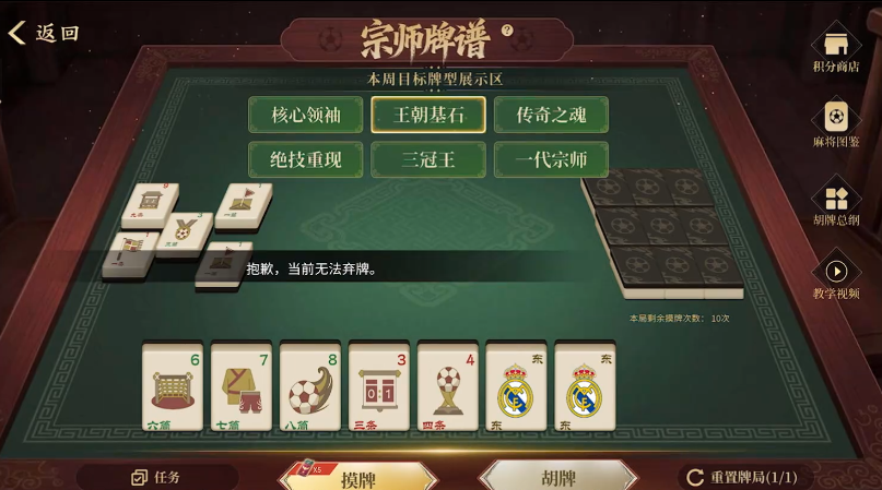 看画面就知道,这款游戏和麻将的玩法类似,通过每日任务获得摸牌机会,然后在不断地“摸牌-打牌”的过程中凑出特定牌型,进而胡牌赢得奖励;在这个小游戏中,原本麻将的牌面也都被换成了足球、奖杯以及球迷熟悉的俱乐部队徽等图案。