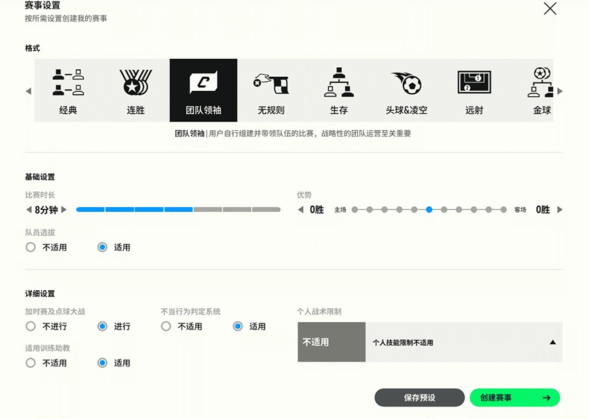 除了能够多人对战,自定义中心还可自由修改比赛规则,房间内预设了包括“金球”“团队领袖”“生存”“无规则”在内的多种趣味规则,通过分享房间邀请码,可以直接让好友或者陌生玩家快速加入比赛,从踢一场更休闲的“娱乐野球局”。